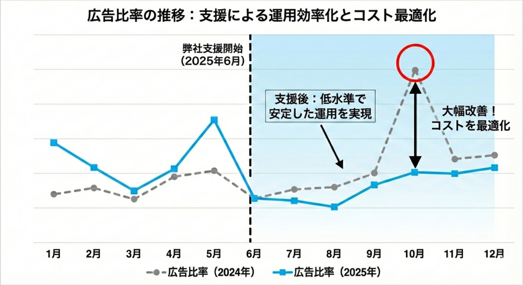 定性面においても、課題の優先順位と改善方針が明確になったことで社内の迷いがなくなり、店舗運営が円滑化しました。短期的な売上不安が解消されたことで、クライアント様は中期的なブランド成長戦略や商品開発に時間を割けるようになり、次年度以降の広告予算増額も決定するなど、積極的な投資サイクルへと転換することができました。