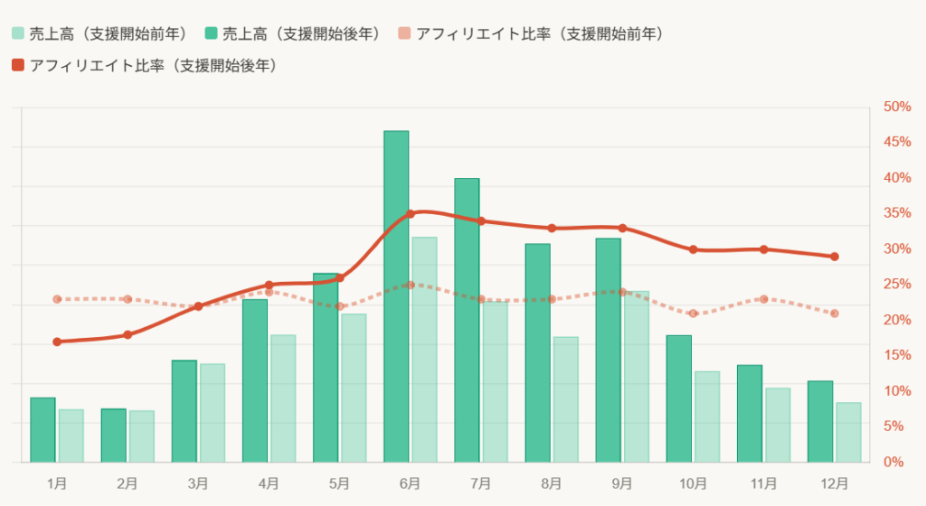 | 定量成果 | ・アフィリエイト経由売上が前年比約1.6倍まで拡大した ・支援開始から約1年で目標KPIのアフィリエイト比率30%を達成した ・店舗全体の売上前年比でYoY120%の目標をクリアした |