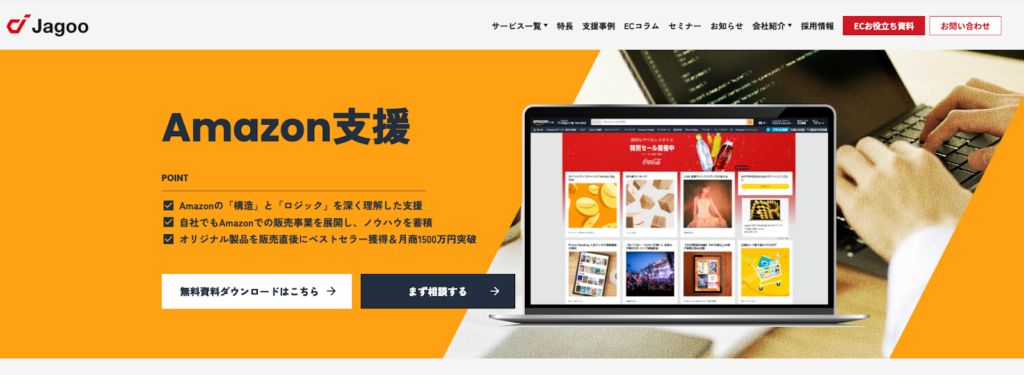 | 特徴 | ・Amazonを自ら運営して得た、現場知と利益設計に基づく支援 ・Amazon特有のアルゴリズムを深く理解した上で、“売上”だけでなく“利益”を見据えた戦略を設計 ・Amazonを熟知した制作チームによる画像制作とページ構成支援 ・Amazon単体の分析にとどまらず、楽天・Yahoo!・Qoo10を含めたチャネル横断支援が強み | ・Amazon特化型のコンサルティングで高い実績 ・データに基づいた的確な戦略で売上 ・利益の向上を目指せる | ・EC事業の総合支援企業 ・広告を事業成長の一手段と捉え、集客から物流まで包括的なコンサルティングを提供する |