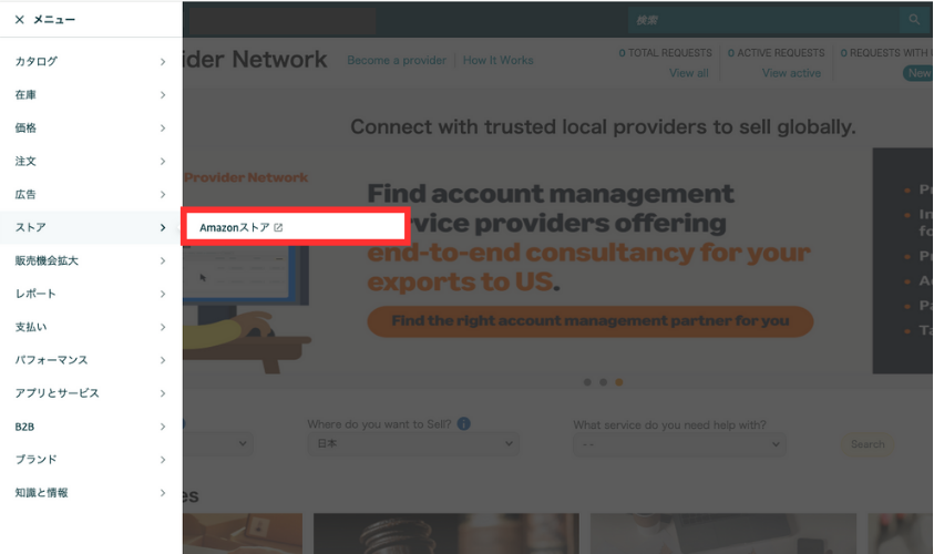 セラーセントラルにログインして、画面上部のメニューから「ストア」を選択し、「Amazonストア」をクリックします。