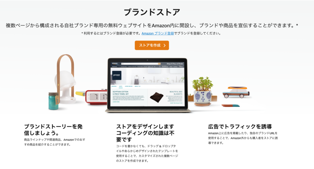 Amazonブランドストアは、大口出品プランを利用し、ブランド登録をしている出品者が無料で利用できるブランディングツールです。