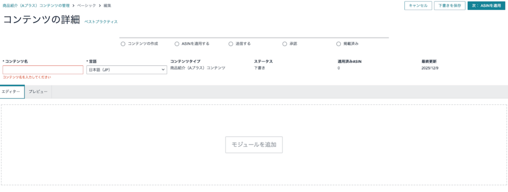 4.画面右上の「商品紹介(Aプラス)コンテンツの作成を開始する」ボタンをクリックします。