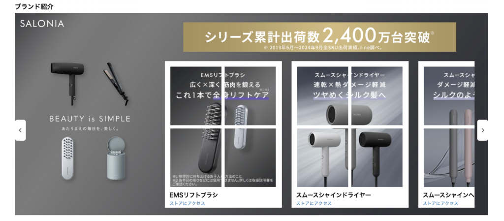 ヘアアイロンで人気のSALONIAは、洗練されたビジュアルによるブランディングが巧みです。モノトーンを基調とした高品質な写真を大きく使い、文章を最小限に抑えることで、「モダンでおしゃれなブランド」という印象を強く与えています。