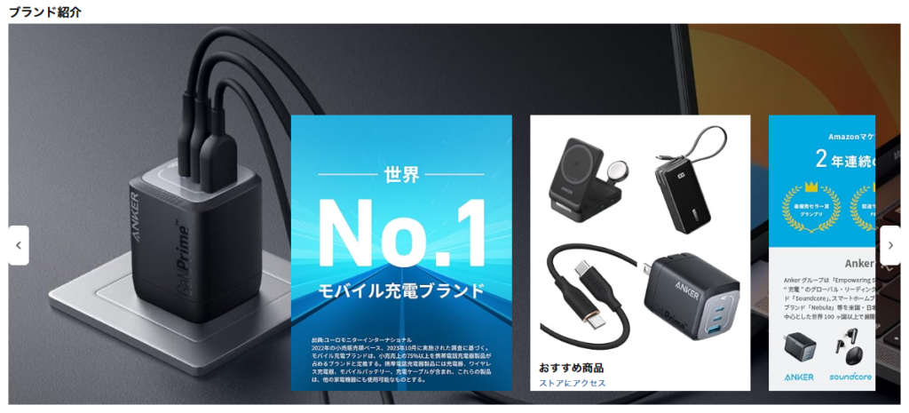 モバイルバッテリーで有名なAnkerは、「世界 No.1 モバイル充電ブランド」という極めて強いポジショニングを取っています。Amazonでは比較検討が前提のため、なぜ選ぶべきかを一瞬で理解させるために、活用していることがわかります。また、個別商品の機能説明よりも前に、世界的評価、実績、受賞歴といったブランド全体の信頼につながる情報を提示しています。