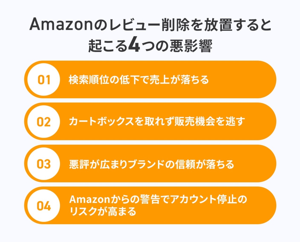ここでは、Amazonのレビュー削除を放置すると起こる4つの悪影響を紹介します。