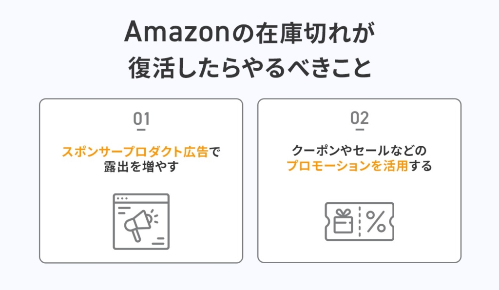 Amazonの在庫切れが発生しても、在庫復活後の適切な対応次第で、売上と検索順位をリカバリーできます。在庫を補充したあとに実施すべき施策は、以下の2つです。