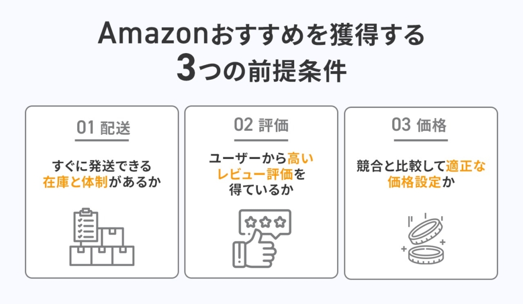 Amazonおすすめを獲得する明確な基準は公表されていませんが、前提として以下の条件をクリアしておくことが重要です。