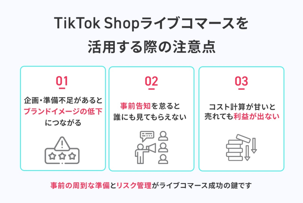 TikTok Shopライブコマースを活用する際の注意点は以下の3つです。