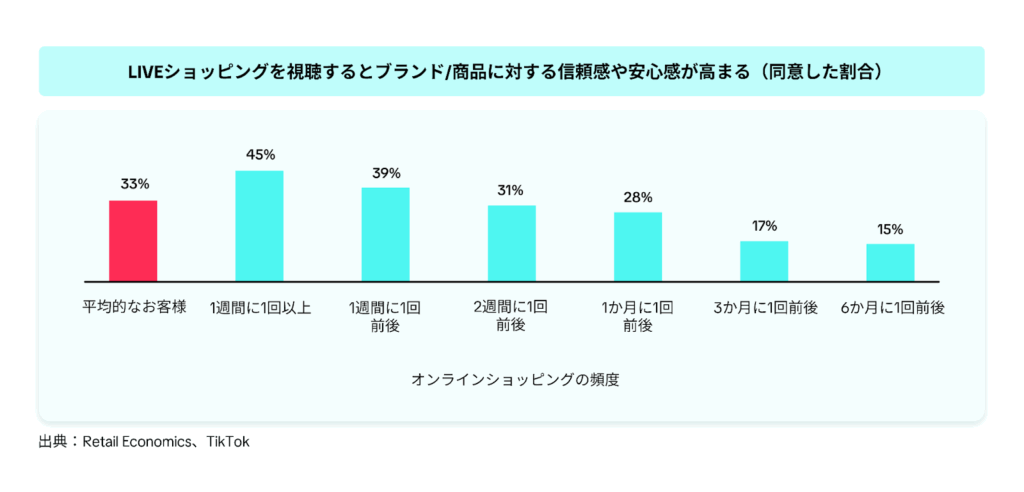 実際にTikTokShopの調査によると、LIVEを見る回数が増えれば増えるほど、ブランドや商品に対する信頼感や安心感が高まることがわかっています。