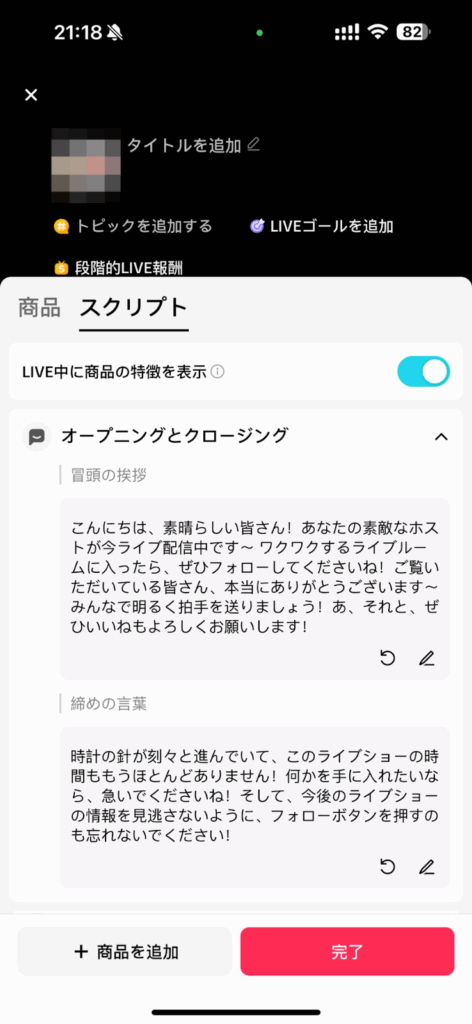 これにより、配信者は構成を考える時間を削減しつつ、より魅力的で説得力のあるライブを実現可能になります。視聴者の関心を維持し、購買行動を促すための「ライブ台本作成アシスタント」として、TikTok Shopでのライブコマースを次のレベルへ引き上げる機能です。