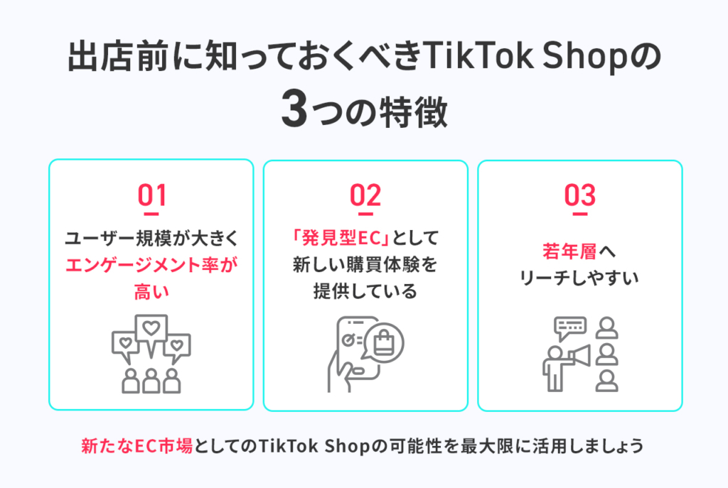 出店を成功させるには、まずTikTok Shopの特性を深く理解しておく必要があります。特に把握しておくべき3つの特徴は以下のとおりです。