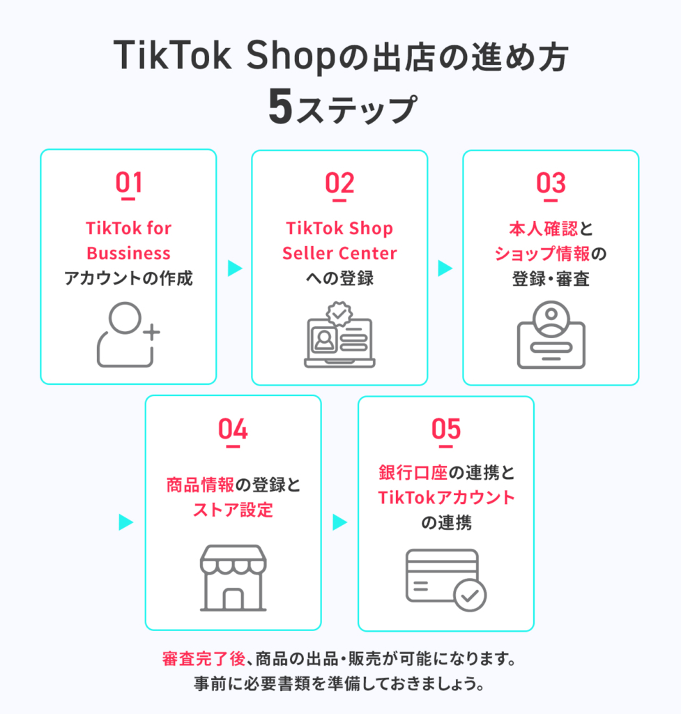 TikTok Shopへの出店は、オンライン上で完結します。出店の進め方は以下の5ステップです。
