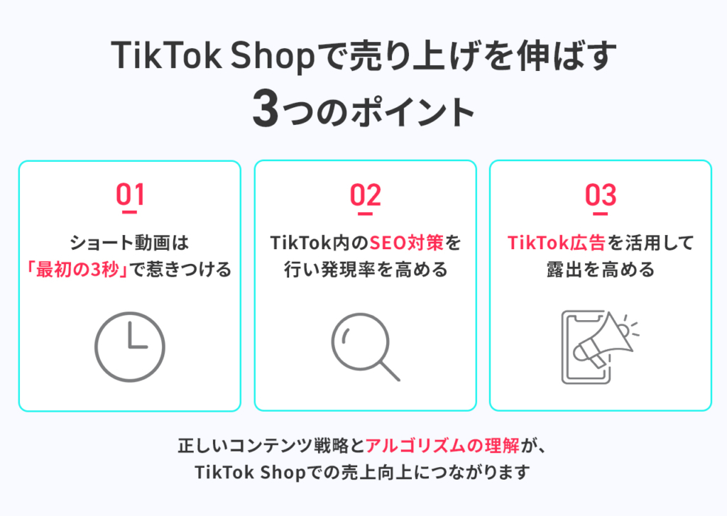 TikTok Shopで継続的に売上を伸ばすには、プラットフォームの特性を活かした戦略が必要です。数ある施策の中でも特に効果的な3つのポイントに絞って解説します。