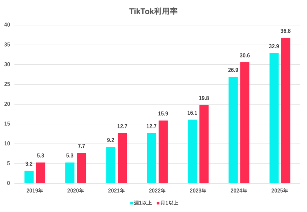 また、2019年と比較すると、2025年の週1以上の利用者は約10倍、月1以上は約7倍に増え、3人に1人が月1以上はTikTokを閲覧していることがわかっています。