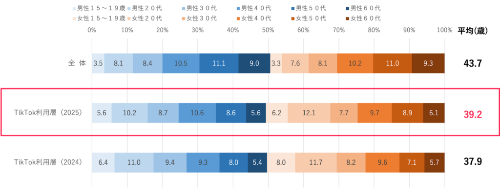 ただし、博報堂2025年調査によると、TikTokユーザーは、中高年層にも広がりを見せており、平均年齢は39.2歳にまで上昇していることがわかっています。