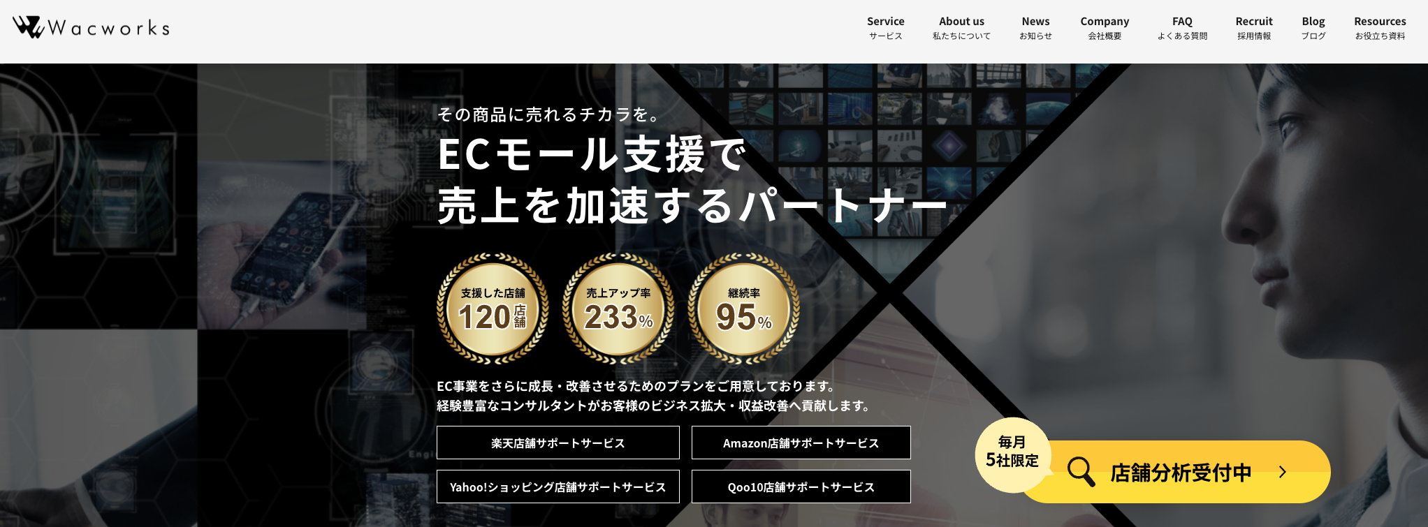 「株式会社Wacworks」は、120店舗以上の支援実績と95%の継続率を持つECコンサル集団です。