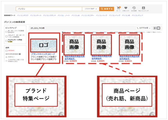 ブランドリーチの主な掲載場所は、Yahoo!ショッピングの検索結果ページの上部など、ユーザーの目に留まりやすい位置です。