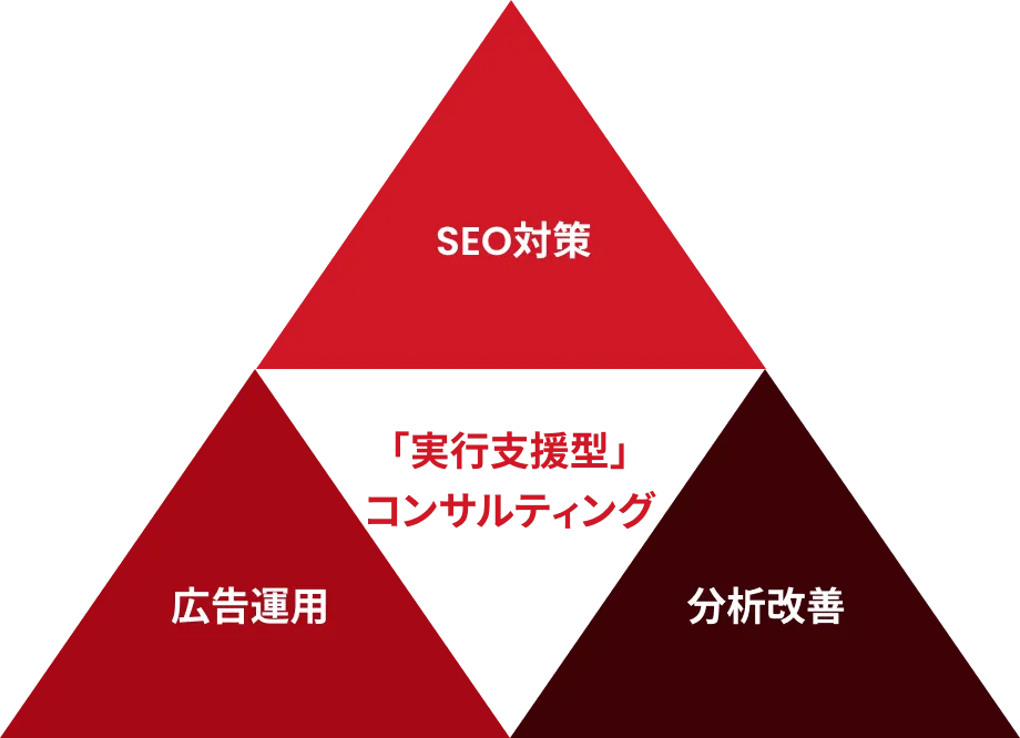 コンサルティングに加えて実務代行まで一気通貫で対応する「実行支援型」のスタイルを強みとしています。単なるアドバイスや作業代行にとどまらず、SEO対策、広告運用、分析改善といった具体的な業務までを『全て実行』することで、確実な成果に結びつけます。