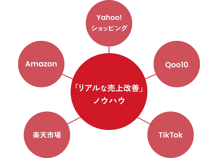 楽天市場、Amazon、Yahoo!ショッピングに加えて、Qoo10、TikTokといった主要ECモール全てに対応し、モールごとの特性を深く理解した専門部隊が伴走支援します。