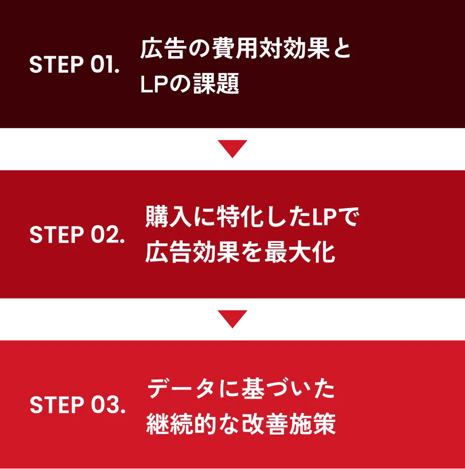ECのプロとして培った「購入心理」のノウハウをLP設計二応用。広告の費用対効果を最大化することに特化した「獲得」と「成約」のためのLPを制作します。さらに、A/Bテストなど通じたLPOで継続的に成果を高めます。