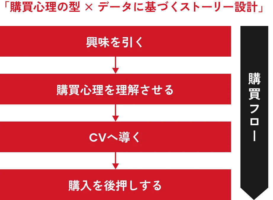 私たちは「売れるストーリー」を設計します。楽天市場、Amazon、Yahoo!ショッピング、Qoo10など、競争の激しい主要ECプラットフォームで、どうすればユーザーが興味を持ち、購入を決意するのか。その購買心理の「型」を、私たちはデータとともに知り尽くしています。その知見をもとに、ユーザーの心を動かし、CVへと導く、論理的なストーリー構成をご提案します。