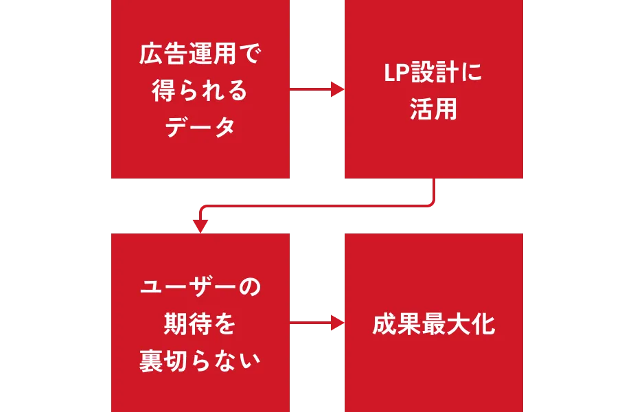 LPの成果は、LP単体では決まりません。私たちは、広告運用で得られた「どんなキーワードにどんな人が反応するのか」というデータをLP設計に活かします。広告のメッセージとLPの訴求を一致させることで、ユーザーの期待を裏切らず、離脱を最小限に抑えでCVを最大化します。