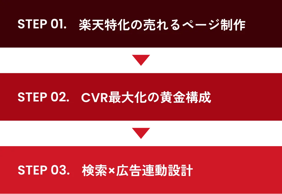 ページは単体で存在するものではありません。制作段階から楽天SEOを意識したキーワードの最適化を行うことで、検索経由の自然流入を育てます。さらに、広告運用と連携し、広告で集めた貴重なアクセスを漏らすことなく、確実に購入へとつなげる「受け皿」としてのページを作り上げ、広告効果の最大化にも貢献します。
