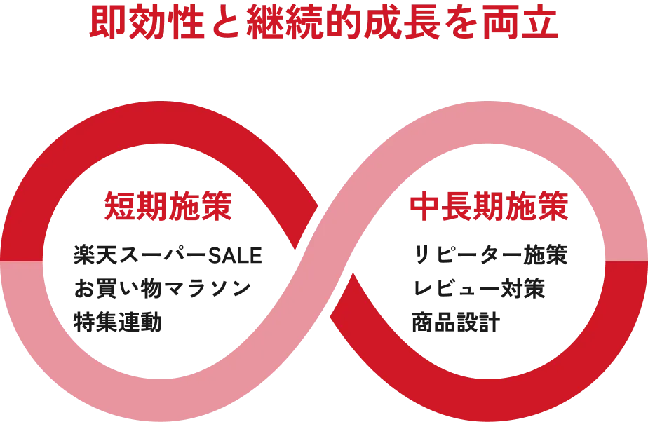 楽天スーパーSALEやお買い物マラソンなど、楽天特有の販売促進にフル対応しています。同時に、リピーター施策やレビュー対策、商品設計など、中長期の成長のための支援も重視しています。