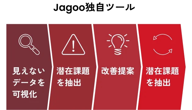 LTV分析ツール、楽天検索順位自動チェックツール、競合の商品販売数分析ツールなど、独自開発のシステムを活用し、RMSでは見えない詳細なデータまで可視化します。お客様が気づいていない潜在的な課題まで掘り下げて言語化し、過去のデータとロジックに基づいた提案を実施します。