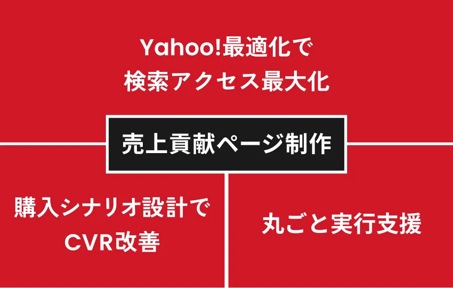 Yahoo!ショッピングの検索順位は、主に「商品スコア」によって決まります。私たちはこのスコアを構成する全要素を最大化する視点でページを設計。検索に強い商品名の付け方、評価される画像の見せ方、適切な情報量など、Yahoo!のアルゴリズムに最適化されたページを作り上げることで、検索経由のアクセスと売上の向上に直接貢献します。
