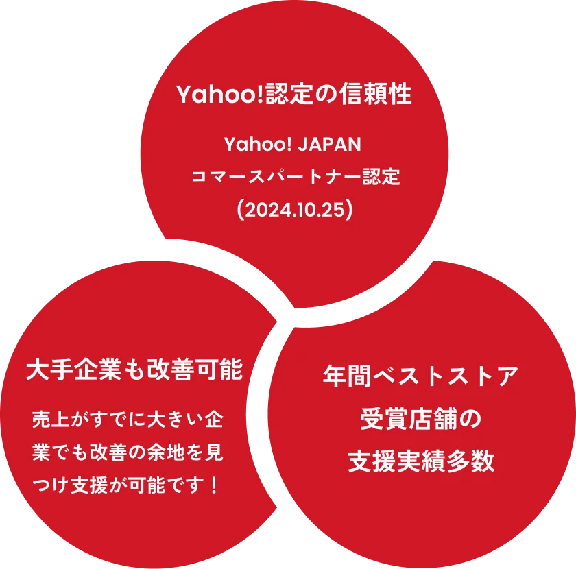 売上がすでに大きい企業でも、改善の余地を見つけ支援が可能です。Yahoo!JAPANコマース認定を受けている、信頼性の高い支援が特徴です。